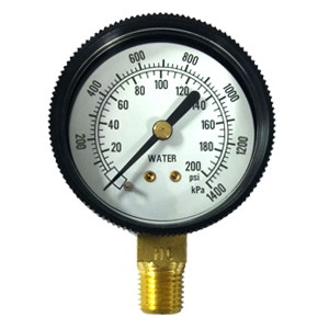 - 0-200# / kpa range, ¼” lower mount, “water” on dial of gauge
